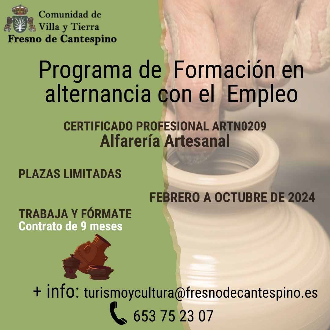 A partir del próximo mes de febrero, y durante nueve meses, la Comunidad de Villa y Tierra de Fresno de Cantespino organizará de nuevo un Programa Mixto de Formación y Empleo. En esta ocasión se impartirá el Certificado Profesional de nivel 2 de Alfarería Artesanal, en colaboración con la Alfarería Martín de Fresno de Cantespino.