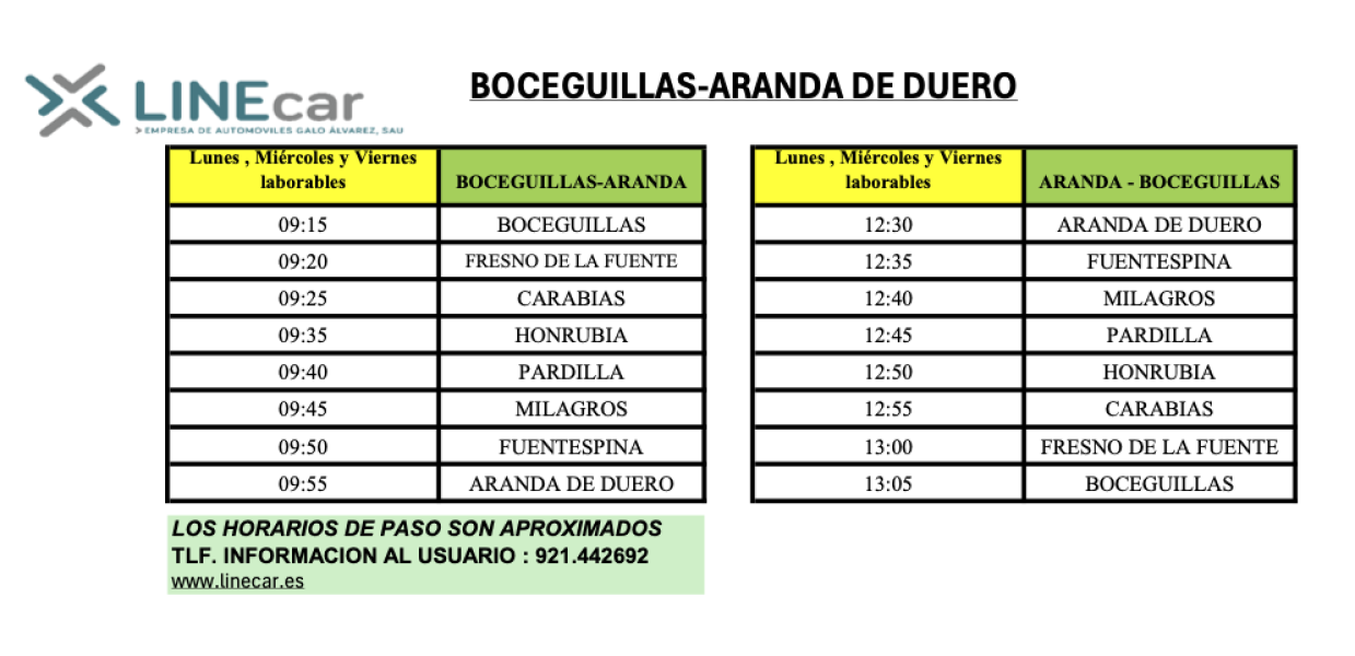 Los municipios del corredor de la A-1 entre Boceguillas y Aranda de Duero recuperan parcialmente su conexión por autobús, tras un mes de interrupciones en el servicio que ha generado importantes trastornos a los usuarios de la zona. LINECAR operará la ruta tres días a la semana -lunes, miércoles y viernes laborables- con dos frecuencias diarias. El autobús partirá de Boceguillas a las 09:15 horas, llegando a Aranda de Duero a las 09:55 horas. El regreso se realizará desde Aranda a las 12:30 horas, con llegada a Boceguillas a las 13:05 horas.