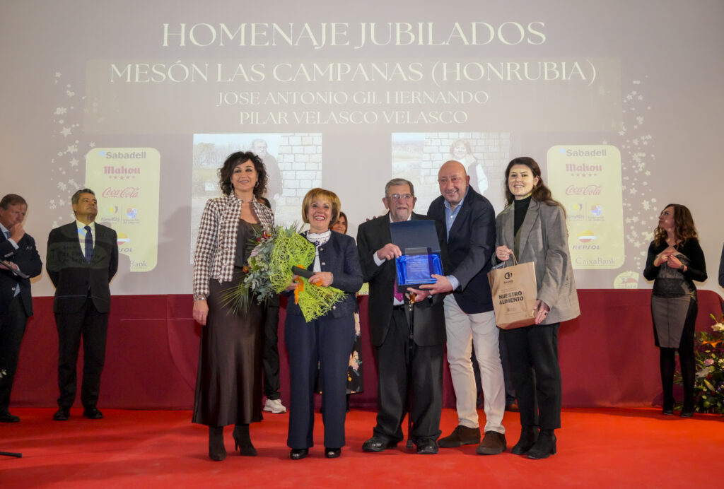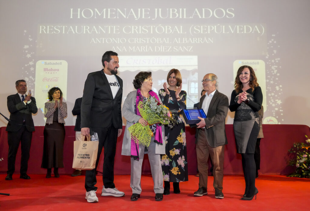 Entre los homenajes más emotivos de la noche estuvieron los dedicados a hosteleros jubilados que han dejado huella en el sector, incluidos dos emblemas de nuestra comarca: Antonio Cristóbal Albarrán y su esposa Ana María Díez Sanz, del "Restaurante Cristóbal" de Sepúlveda, y José Antonio Gil Hernando junto a su mujer Pilar Velasco Velasco, del "Mesón Las Campanas" de Honrubia, quienes recibieron un merecido reconocimiento por su trayectoria profesional y su aportación a la gastronomía local.