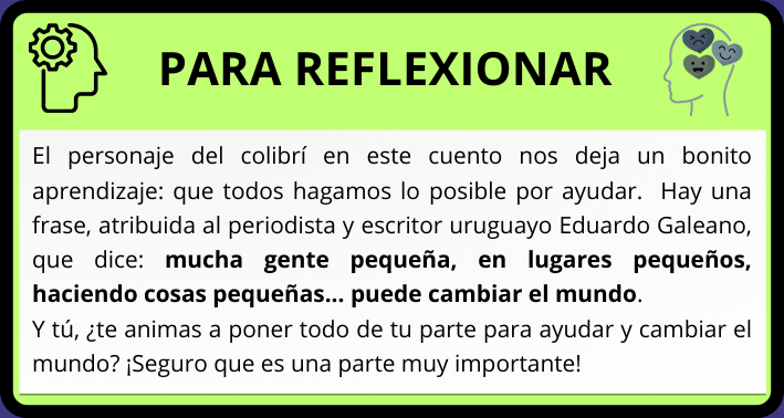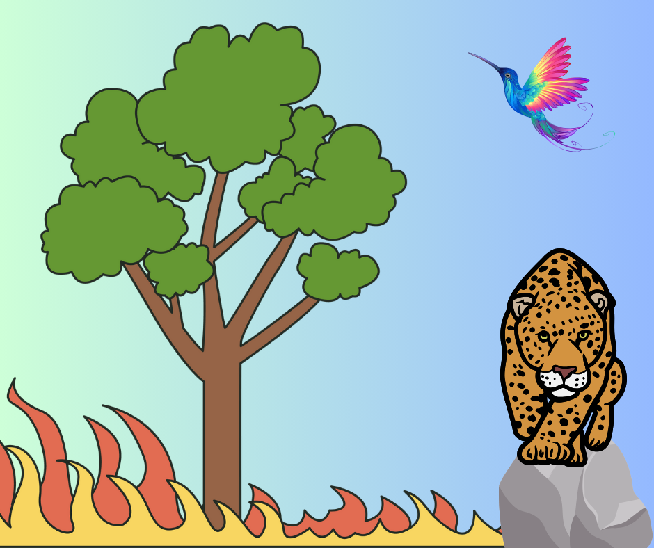 El colibrí siguió volando hacia arriba y hacia abajo, fiel a su plan. El jaguar se quedó parado entre la multitud de animales que corrían hacia el sur, arrepentido por haberse reído del colibrí y reflexionando si él podría hacer algo más por ayudar.