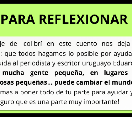 Pero en esta huída tan sincronizada sorprendía la actitud de un pequeño colibrí. Aleteaba fuerte y rápido, volando por debajo del resto de aves y por encima de los animales cuadrúpedos. Parecía ser el primero en escapar, pero en poco tiempo el colibrí ¡volvía en la dirección del incendio! Todos los animales le advertían del peligro de volar hacia la zona norte del bosque. Más sorprendente era cuando de nuevo veían al colibrí volar sobre sus cabezas y escapar. Y al poco tiempo, de nuevo, volver en dirección al fuego. Así pasaba de manera repetitiva.