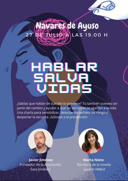 Conseguir que esta realidad cambie es cosa de todos, pero para ello hay que aprender a detectar las señales de riesgo y, sobre todo, despertar la escucha. Ese es el motor de la charla que van a impartir Javier Jiménez, fundador de la Asociación Sara Jiménez, creada para luchar contra el suicidio de jóvenes y adolescentes, y la periodista Marta Nieto, que acaba de publicar Habla, una conmovedora novela juvenil para agarrarse a la vida.