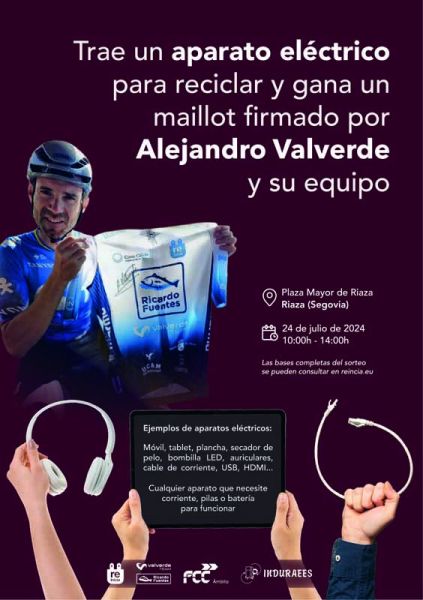 Reinicia comenzó su colaboración con Alejandro Valverde con el objetivo de ayudar a los jóvenes a practicar el ciclismo con los medios necesarios para competir en las mejores pruebas del calendario nacional y también para concienciarles en la importancia del reciclaje. Por eso, con la cooperación del gestor de residuos de aparatos eléctricos y electrónicos Induraees-Fcc Ámbito, ubicado en Palencia, colocarán un stand al que los riazanos y vecinos de otras localidades podrán llevar cualquier tipo de aparato eléctrico que quieran reciclar. Además, por cada aparato entregado, el participante recibirá una papeleta para entrar en el sorteo de un maillot firmado por Alejandro Valverde y su equipo. Las bases del concurso se encuentran en la web de Reinicia (www.reinicia.eu).